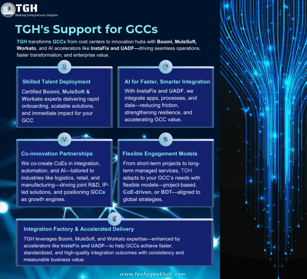 Global Capability Centers (GCCs) have emerged as strategic innovation and operational excellence hubs for multinational enterprises. With India as the leading destination, GCCs are transforming from cost arbitrage models to value-driven centers of digital transformation, advanced technology adoption, and AI-powered innovation. At TGH Software Solutions, we recognize the growing importance of GCCs and aim to partner with them by providing deep expertise in integration services across platforms like Boomi, MuleSoft, and Workato.