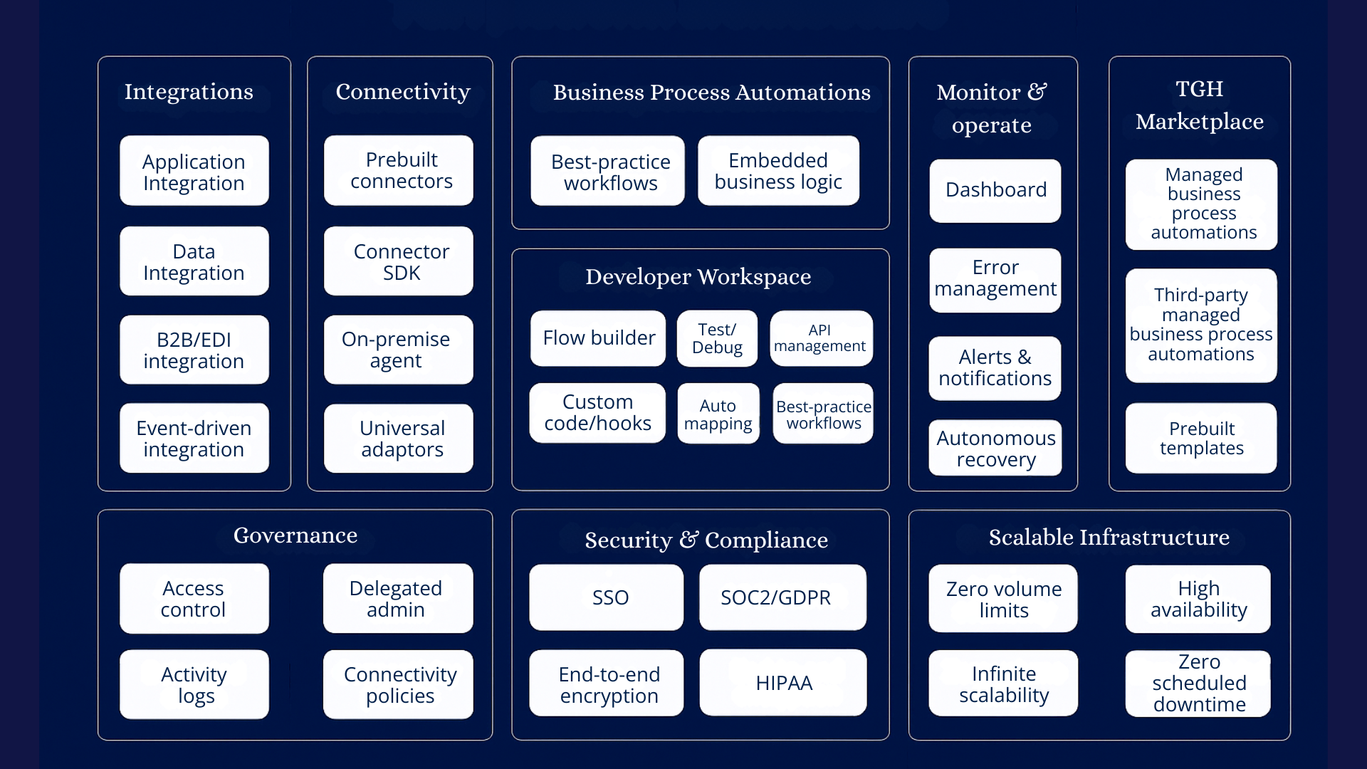 In today’s integration-first enterprise landscape, businesses need more than connectors—they need unified automation, governance, and scalability. The Celigo Integration Platform brings all these capabilities together through a single, intelligent ecosystem. At TGH, we enable enterprises to leverage Celigo’s end-to-end capabilities across integrations, connectivity, automation, monitoring, governance, security, and infrastructure. This ensures faster workflows, stronger compliance, and seamless scalability across every system in your organization.