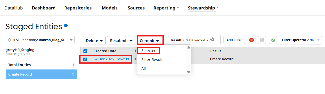 In the UI You as a steward will review the records and select the records which you want to commit then click on Commit and click on selected tab and then click on ok