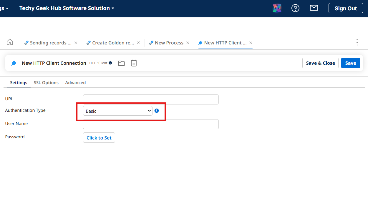 Click on plus icon in connection tab to create connection component and click on basic authentication