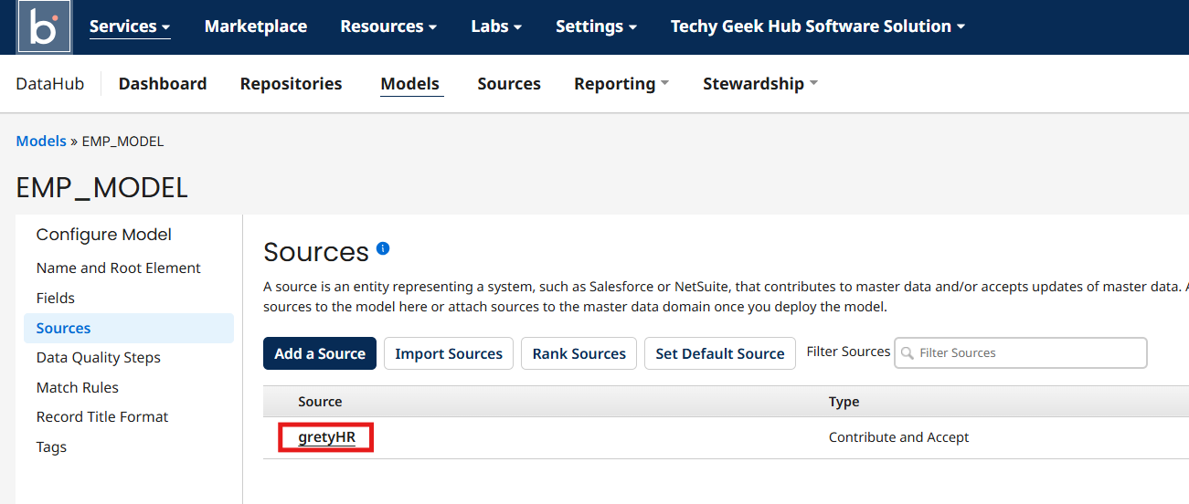 Now Navigate to repositories, select your repository and choose search for EMP_MODEL and navigate to Sources tab
