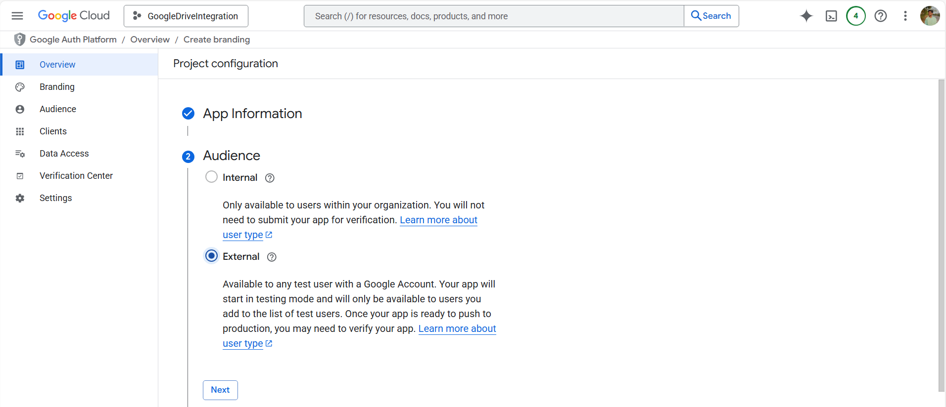 7. Enter the App name, User support email, and select the User type as External. Provide a valid Developer contact email, agree to the Terms of Service, and click Next to proceed. Lastly, click on create to create the project.