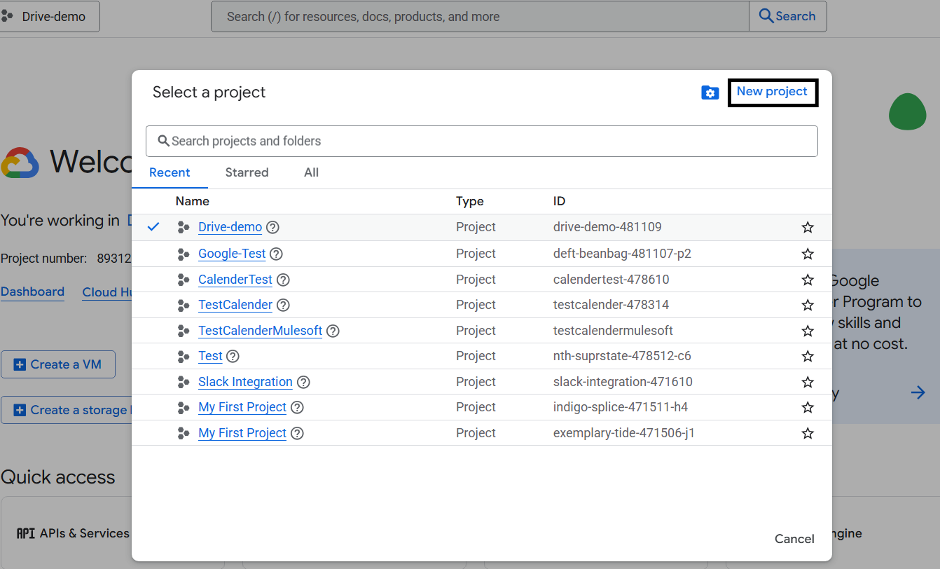 1. Navigate to https://console.cloud.google.com , open the project picker located at the top of the page, and click on New Project to create a new project.