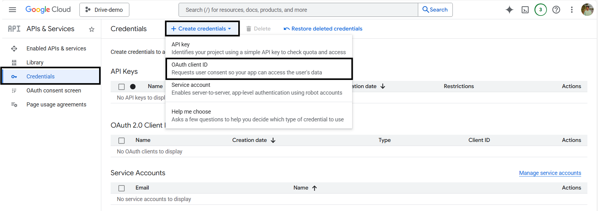 6. Click on Create Credentials and select OAuth Client ID from the available options.