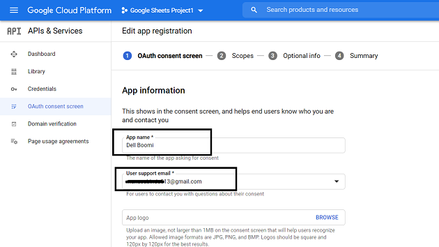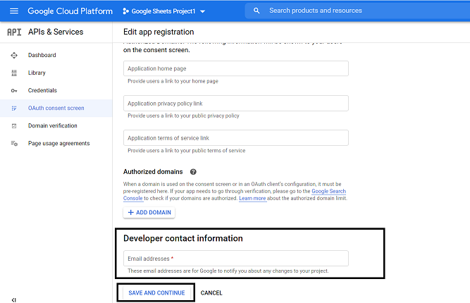 Step 9: Give the App name Dell Boomi and give your Email ID. Scroll down and give the developer’s email ID so that any changes made to the project will be notified. Click on save and continue.
