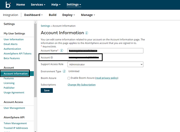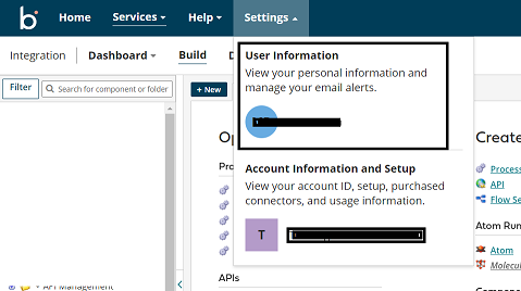 - To get a Boomi Account ID, log into the Boomi Platform. Go to settings and click on User Information.