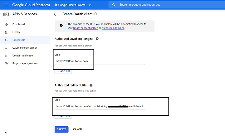 Step 14: We have to specify the name, Authorized Java Script Origin uri and Authorized Redirect uri.