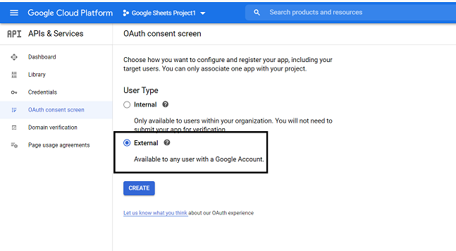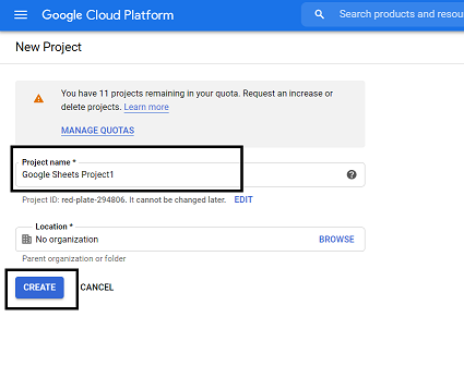 Step 2: Now, let us create a project. Click on Create a project and give the project name as Google Sheets Project1. Select create.