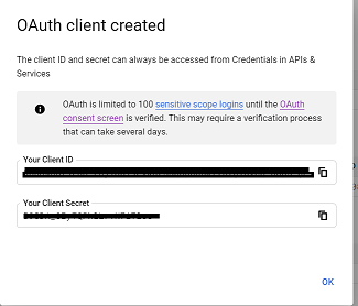 Step 16: We see that the Client ID and Client Secret key have been generated and will be responsible for creating a connection to Google Sheets in Boomi. Click ok.
