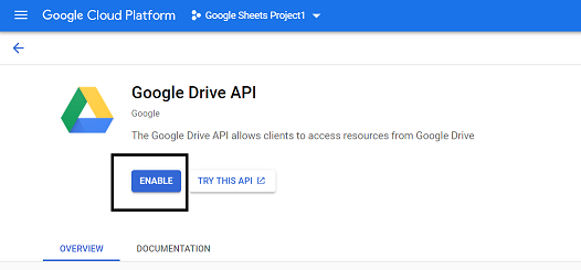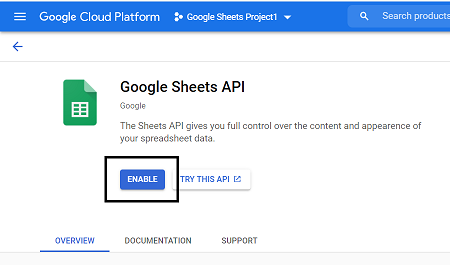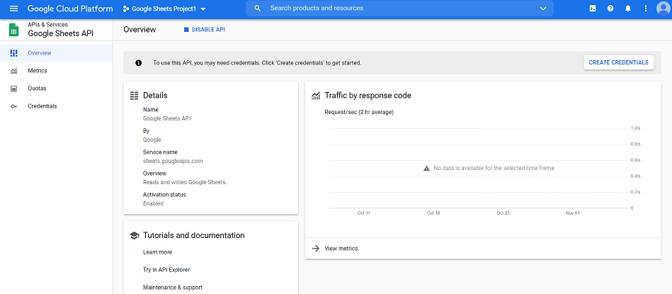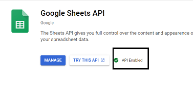 Step 6: Choose Enable and we see that Google Sheets is Enabled and we have to create credentials to use this API.