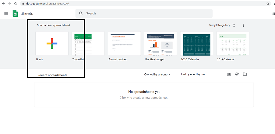 - Click on the link https://docs.google.com/spreadsheets/u/0/ and authenticate with email ID and password and then you will be able to see the spreadsheet. Choose Blank.