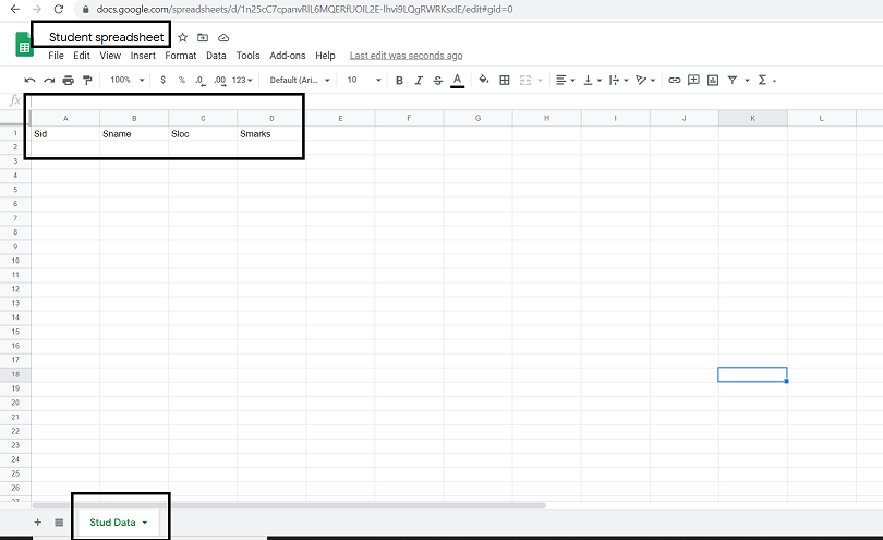 - Name the spreadsheet as “Student Spreadsheet” and add 4 columns. Also, name the sheet Stud Data as shown below.