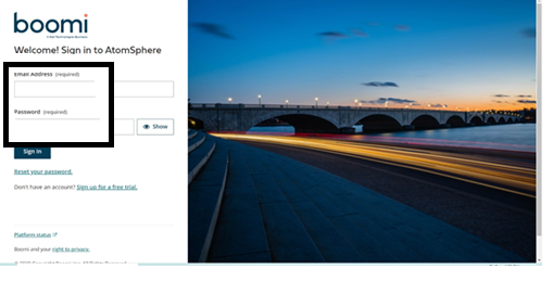 Step 1: Log on to the Boomi platform (https://platform.boomi.com/) with the required credentials i.e. Email Address and Password.