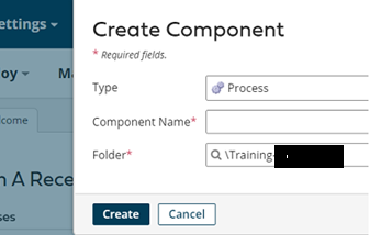 - Select Type as process as we are building a process. Component Name and Folder can be given based on your choice (i.e. which name to be given and where do we want to create the process). Click on Create.