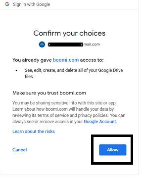 Step 10: We will be asked to choose an account to continue with Boomi.
