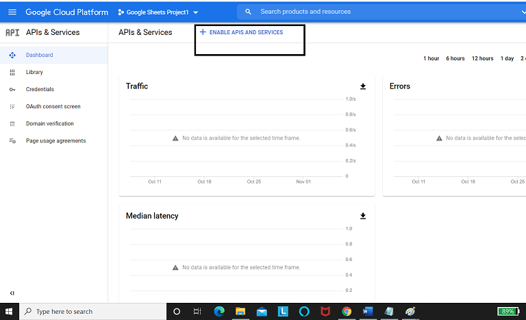 Step 19: Navigate to Dashboard and search for Google Sheets API and Google Drive API’s. We see APIs are enabled.
