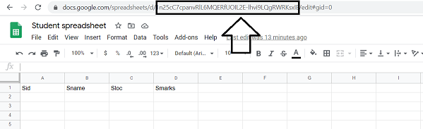 Spreadsheet ID: We can get the spreadsheet ID from the URL as shown.