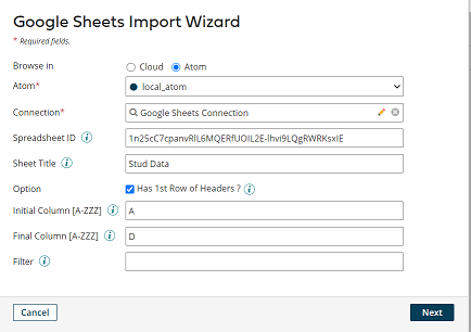 Connection: Choose the same connection which we have configured in Google Sheets Connection.