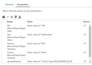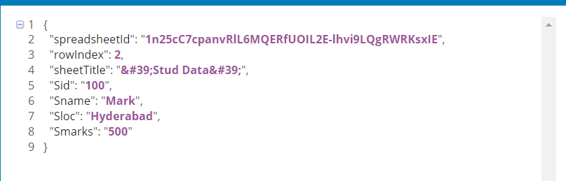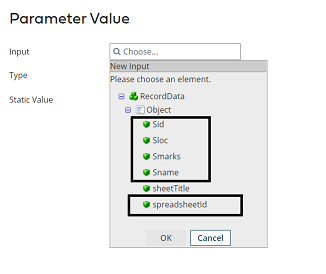 Step 14: Click + and select inputs as Sid, Sloc, Smarks, Sname and spreadsheetId.
