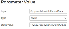 - Choose Input type as spreadsheetId, Type as Static and Static Value as 1n25cC7cpanvRlL6MQERfUOIL2E-lhvi9LQgRWRKsxIE.