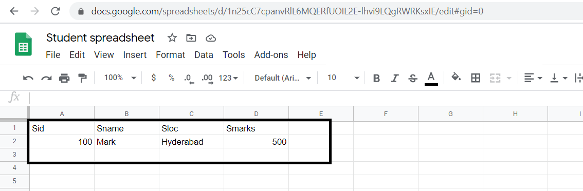 Step 20: We will create a Google spreadsheet with 4 headers as sid, name, sloc, and smarks and will send the values via Boomi by configuring the operation in Google Sheets.