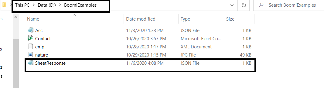 - Name the file and give the directory to save the response file. Here, it is the D drive and BoomiExamples folder as shown in the screenshot.