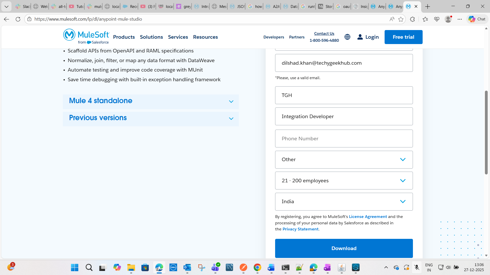 • Download the Mule Standalone Server by visiting the Download Anypoint Studio & Mule page, filling in the required form, and clicking the Download button.