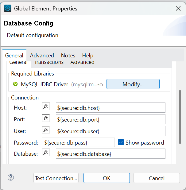1. Next, we’ll add a Database Select operation to our flow and configure it to query the required data. To ensure security, we’ll reference the database connection details using secure property placeholders, which allows us to keep sensitive credentials encrypted and externalized from the main codebase. Database Select operation