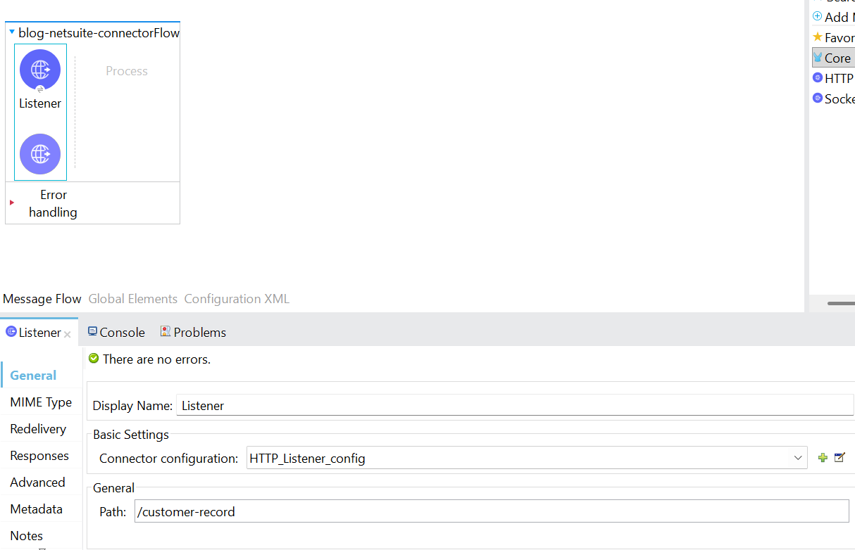 1. To begin, a new Mule project needs to be created. Then, an HTTP listener component needs to be dragged and dropped into the project from the HTTP module. Configure the listener, and set the host to All interface (0.0.0.0), port number as 8081. Set the path as /customer-record.