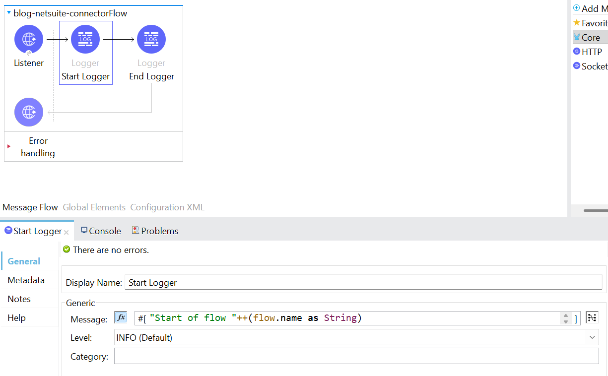 2. Following the addition of the listener component, include two loggers to mark the beginning and the end of the flow. By logging the message “Start of flow” ++ (flow.name as String), in expression mode.