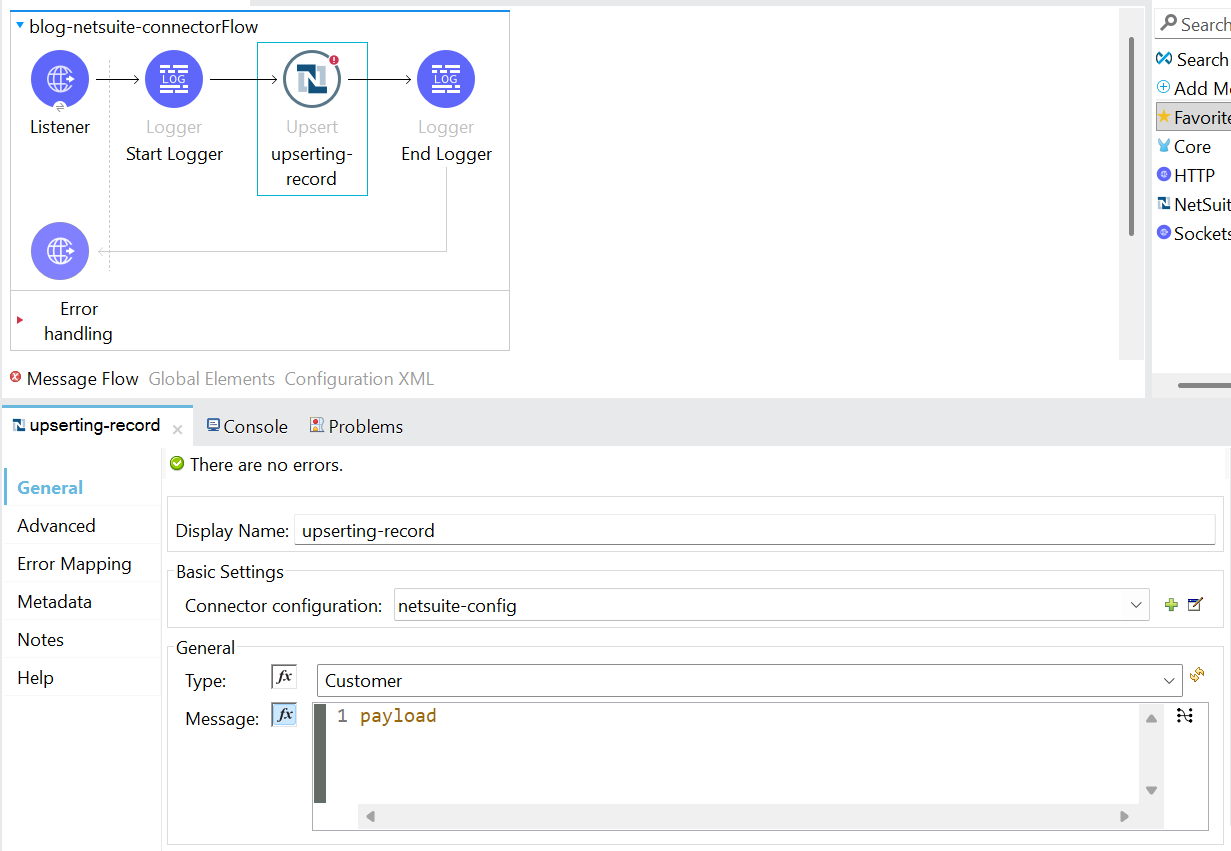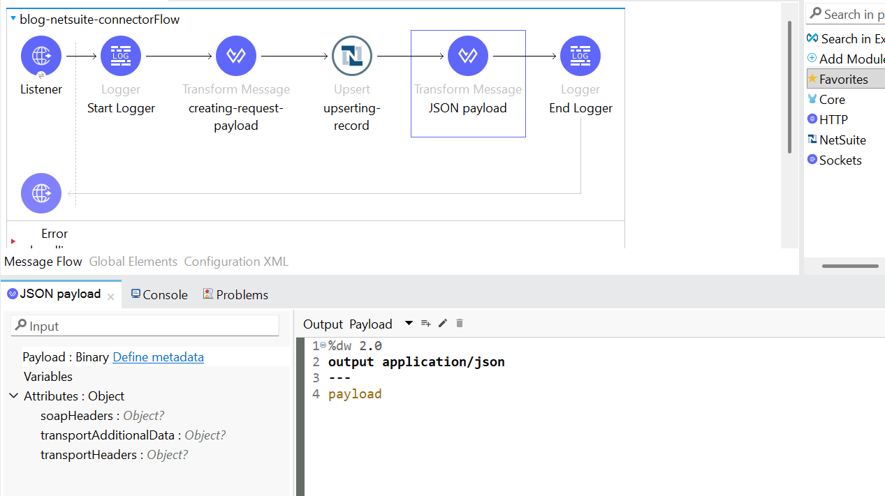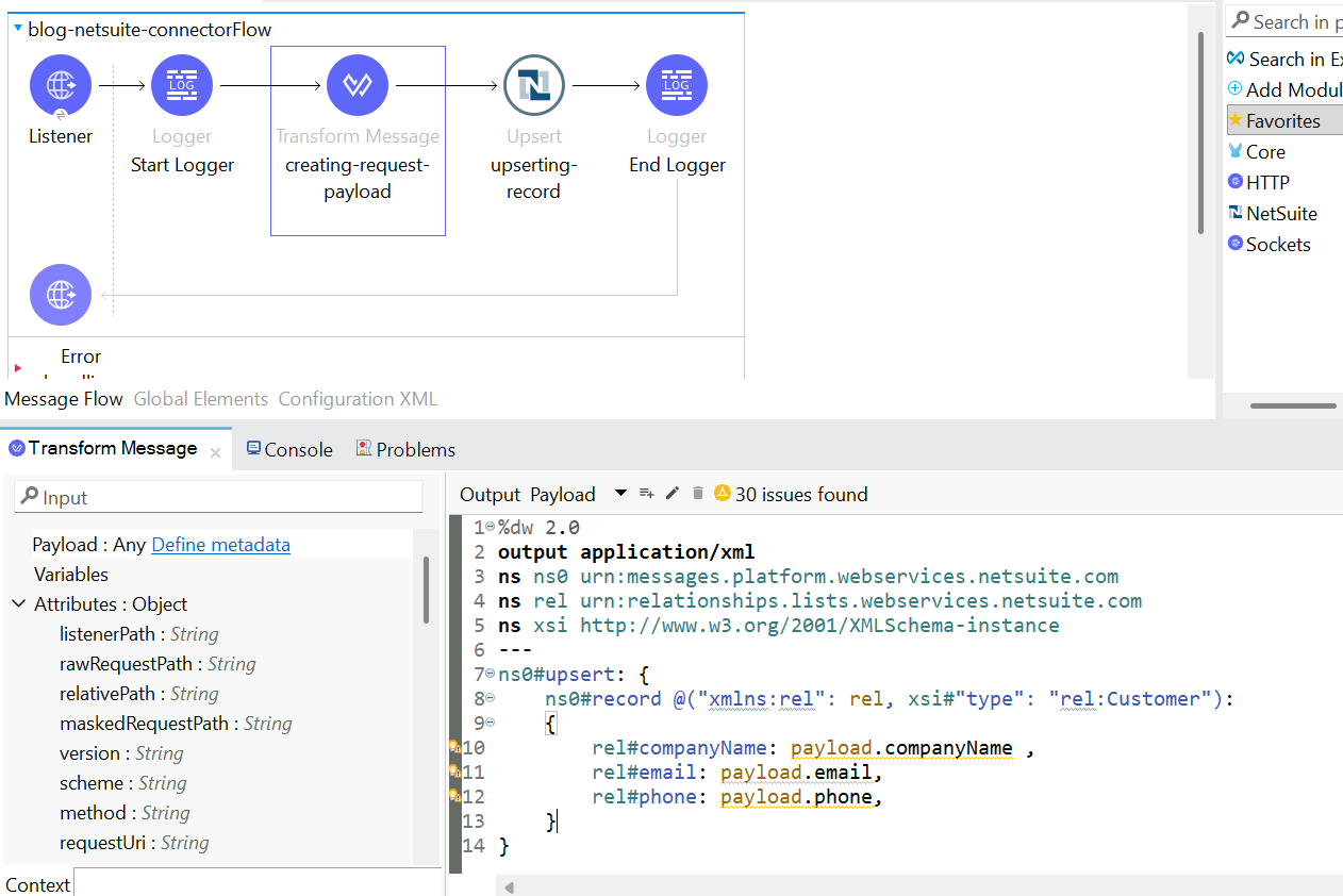 • Next, add the transform message before the NetSuite connector to form the XML request body.