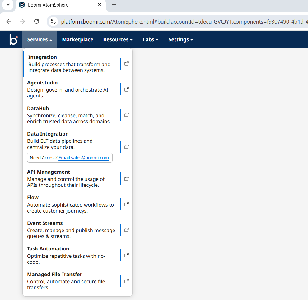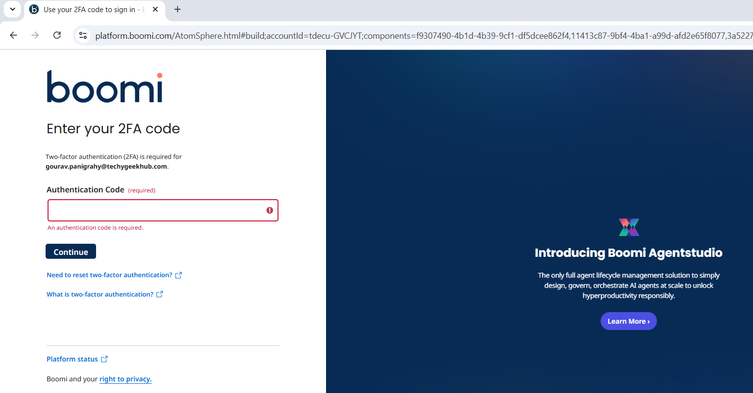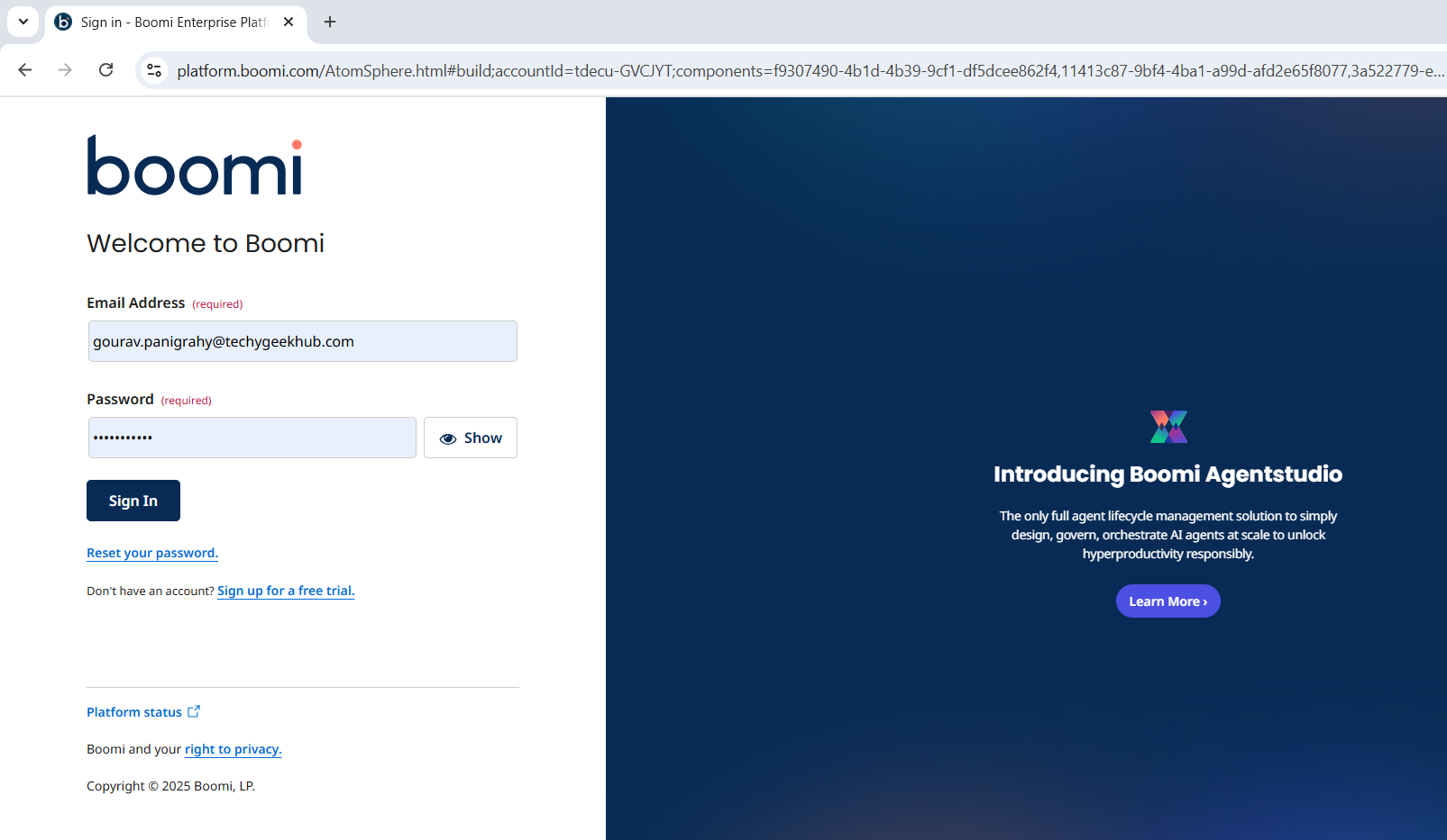 Step 1 – log onto the Boomi platform (https://platform.boomi.com/) with the required credentials i.e. Email Address and Password.