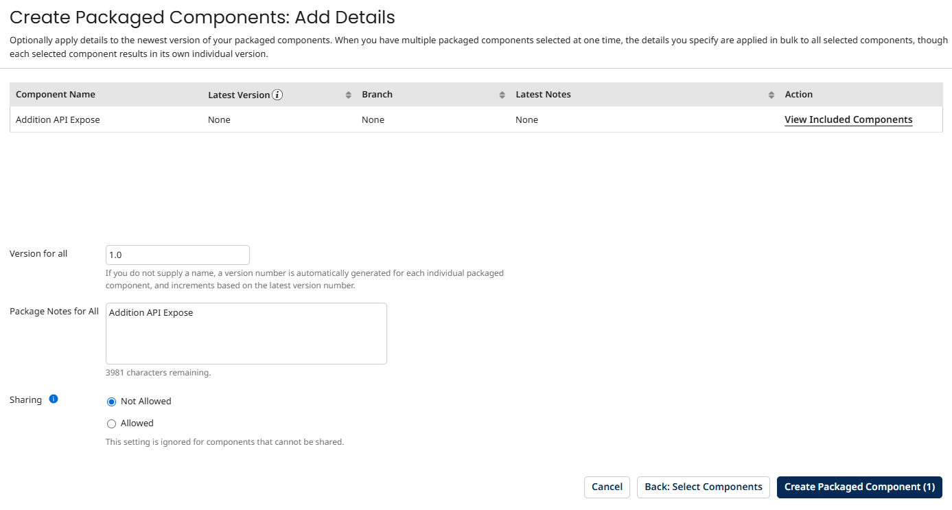 Step 8 – Will give a name to our process and save, later will proceed to create a packaged component by clicking on the create packaged component and click on add details followed by providing a version number and packaged notes.