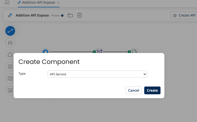 Step 13 – Now that our API has been exposed, we have to use API Service Component and Gateways to apply a API Policy. In this step, we will configure the API Service Component, in component type we will choose API Service and click on create.