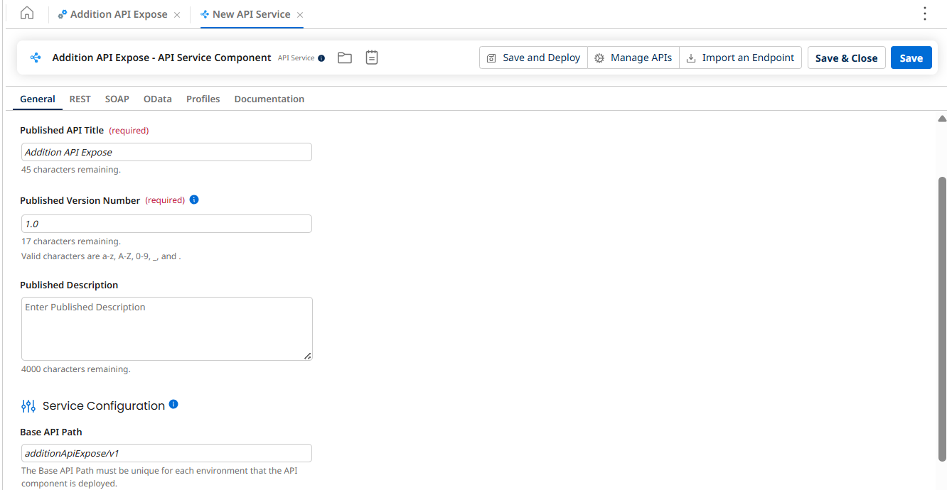Step 14 – We have to give a name to our API Service component and provide details in the Published API title, version number and base API path and then click on Import an Endpoint.