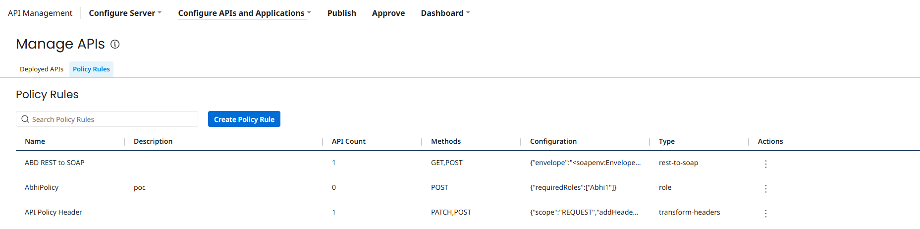 Step 52 – Click on Configure APIs and Applications>Manage APIs. Click on Policy Rules tab & click on create policy rule.