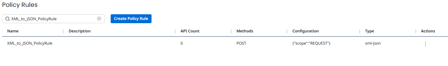 Step 55 – Search for XML_to_JSON_PolicyRule, we created to attach to our request of the API. Click on the 3 dots.