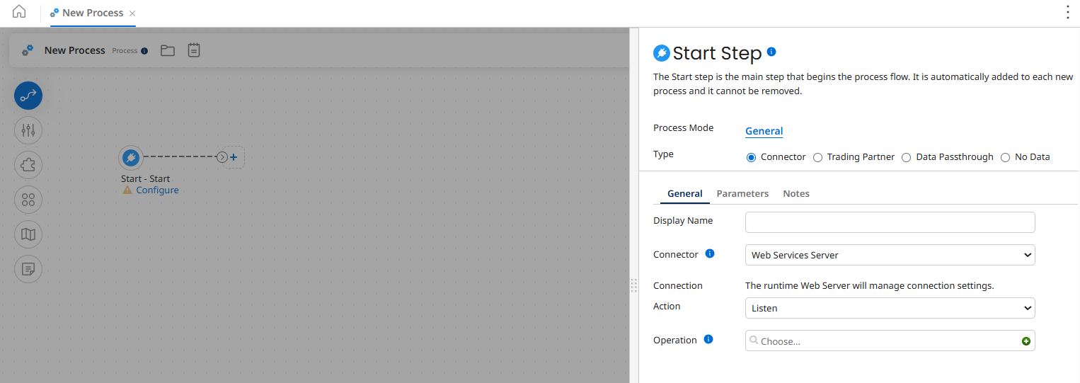 Step 4 – Choose a start shape of connecter type, and choose web services server connector, because we are exposing an API where we will be applying the API Policies.