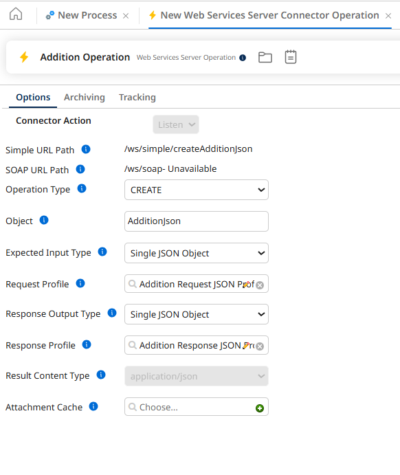 Step 5 – Click on + Operations to create a new operation, Give Operation a name, choose operation type, give a value to object and we are choosing the request and response as single json object and we are attaching the corresponding json profiles accordingly, and then save and close the component.